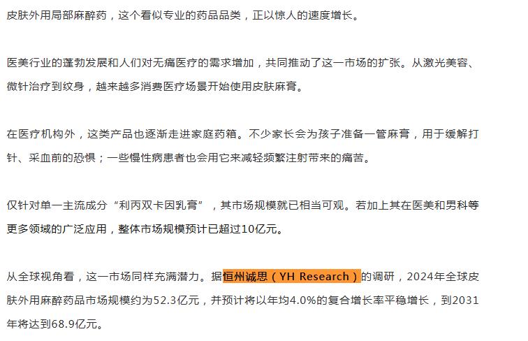1月29日恒州诚思(YHresearch)发布的皮肤外用麻醉药品市场报告被微信公众号:医学美学美容 引用