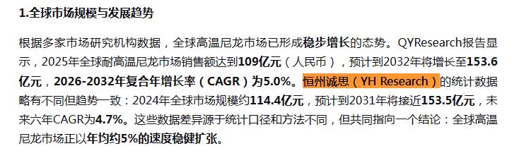 1月30日恒州诚思(YHresearch)发布的高温尼龙市场报告被微信公众号:尼龙产业链 邵君 引用