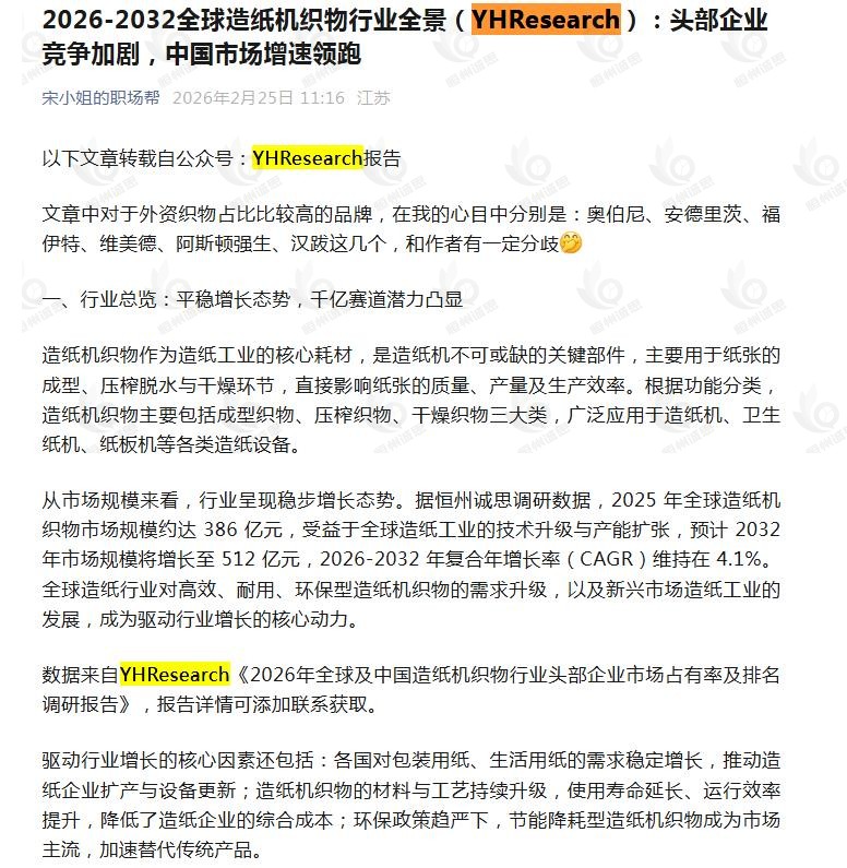 2月25日恒州诚思(YHResearch)发布的造纸机织物市场报告被微信公众号:宋小姐的职场帮 引用