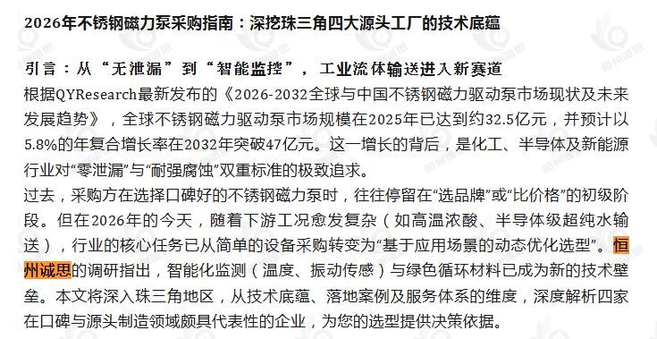 3月20日恒州诚思(YHResearch)发布的不锈钢磁力驱动泵市场报告被微信公众号:创升泵业 引用