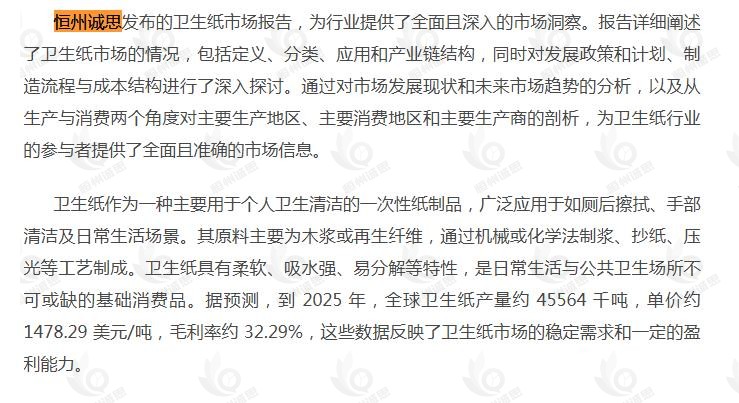 3月24日恒州诚思(YHResearch)发布的卫生纸市场报告被微信公众号:纸业邦 引用